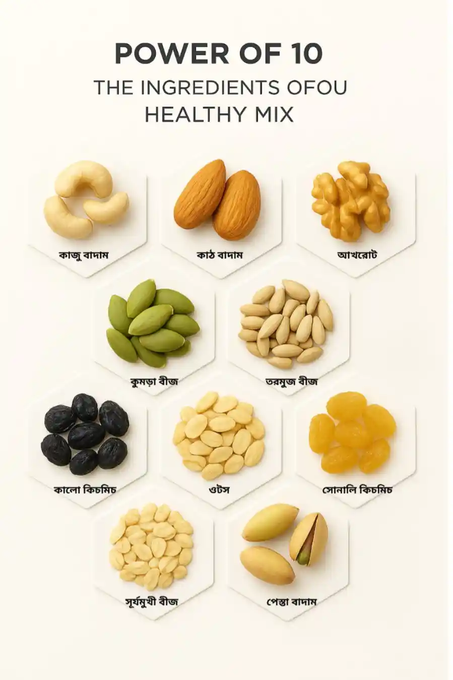 আমাদের প্রতিটি উপাদান সুপার ফুড ক্যাটাগরির মধ্যে থেকে যাচাই-বাছাই করে নির্বাচিত—যা পুষ্টিতে ভরপুর ও স্বাস্থ্যের জন্যে উপযুক্ত।